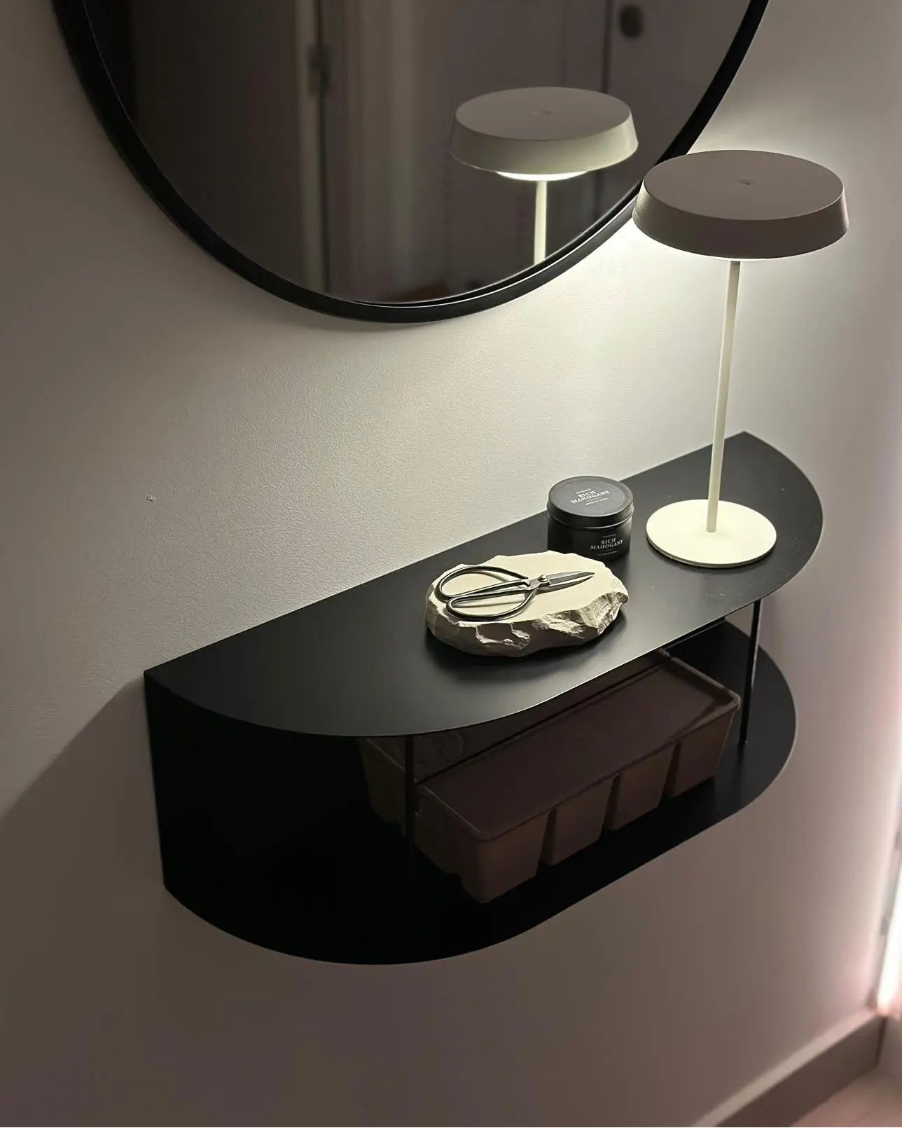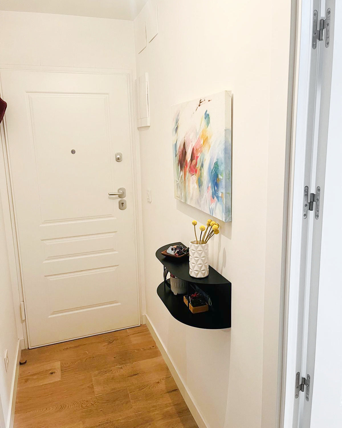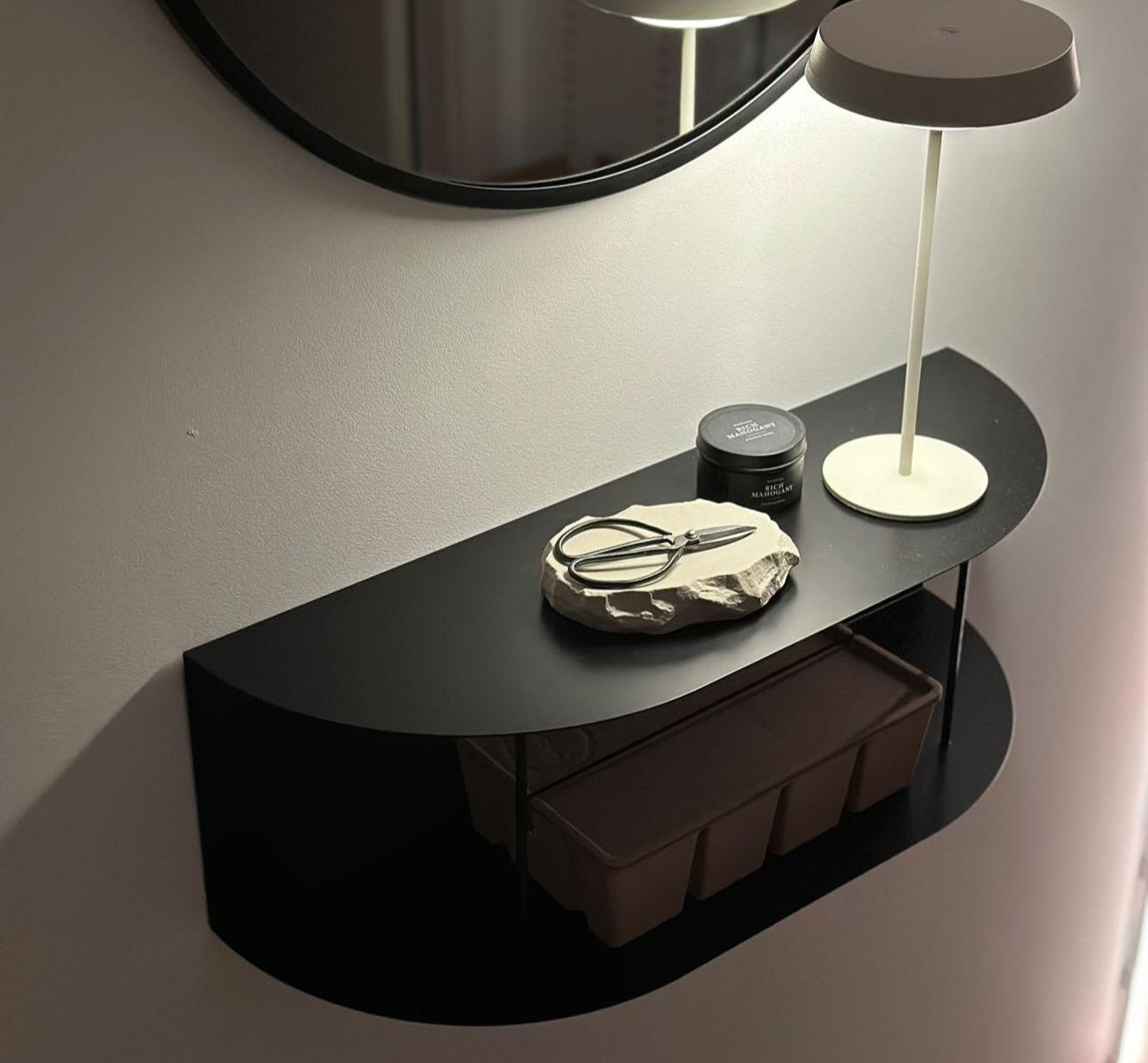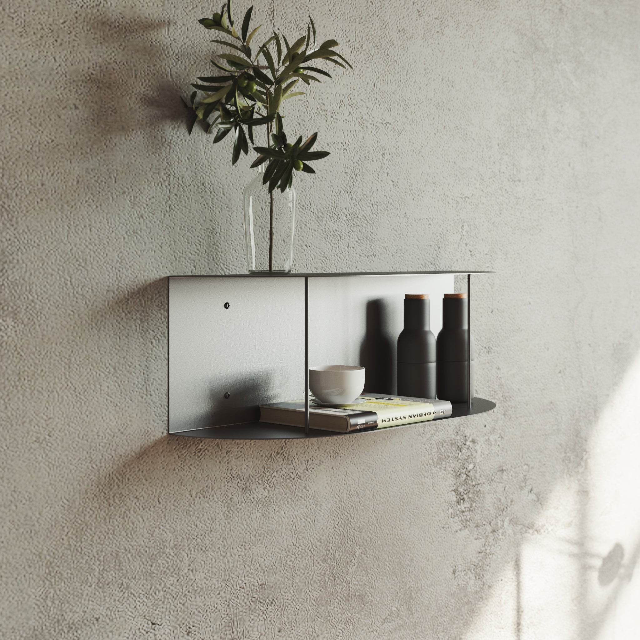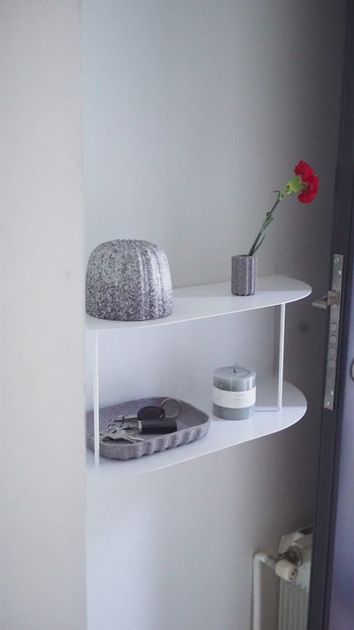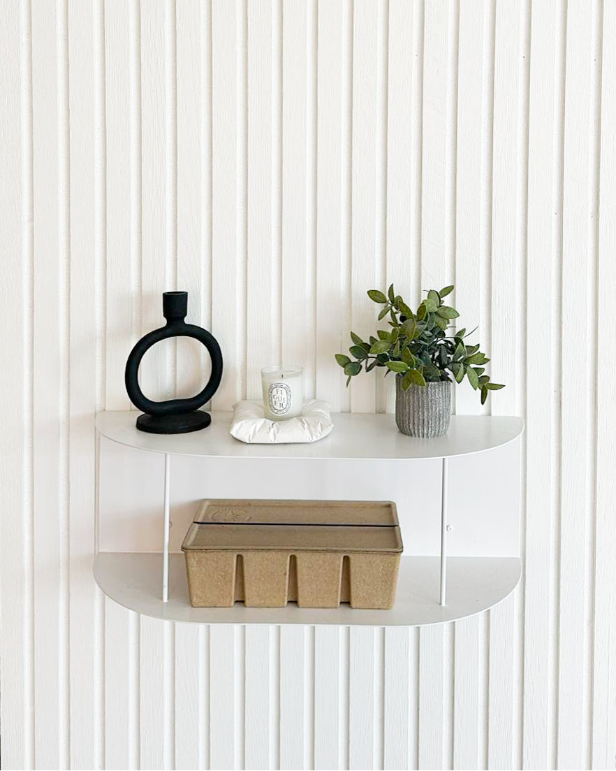 Prestatgeria flotant de metall elaborada amb xapa de 1,5 mm amb reforços verticals. Disseny minimalista i contemporani a U. Fes-lo servir com a rebedor o com a prestatge per organitzar i decorar la teva llar.