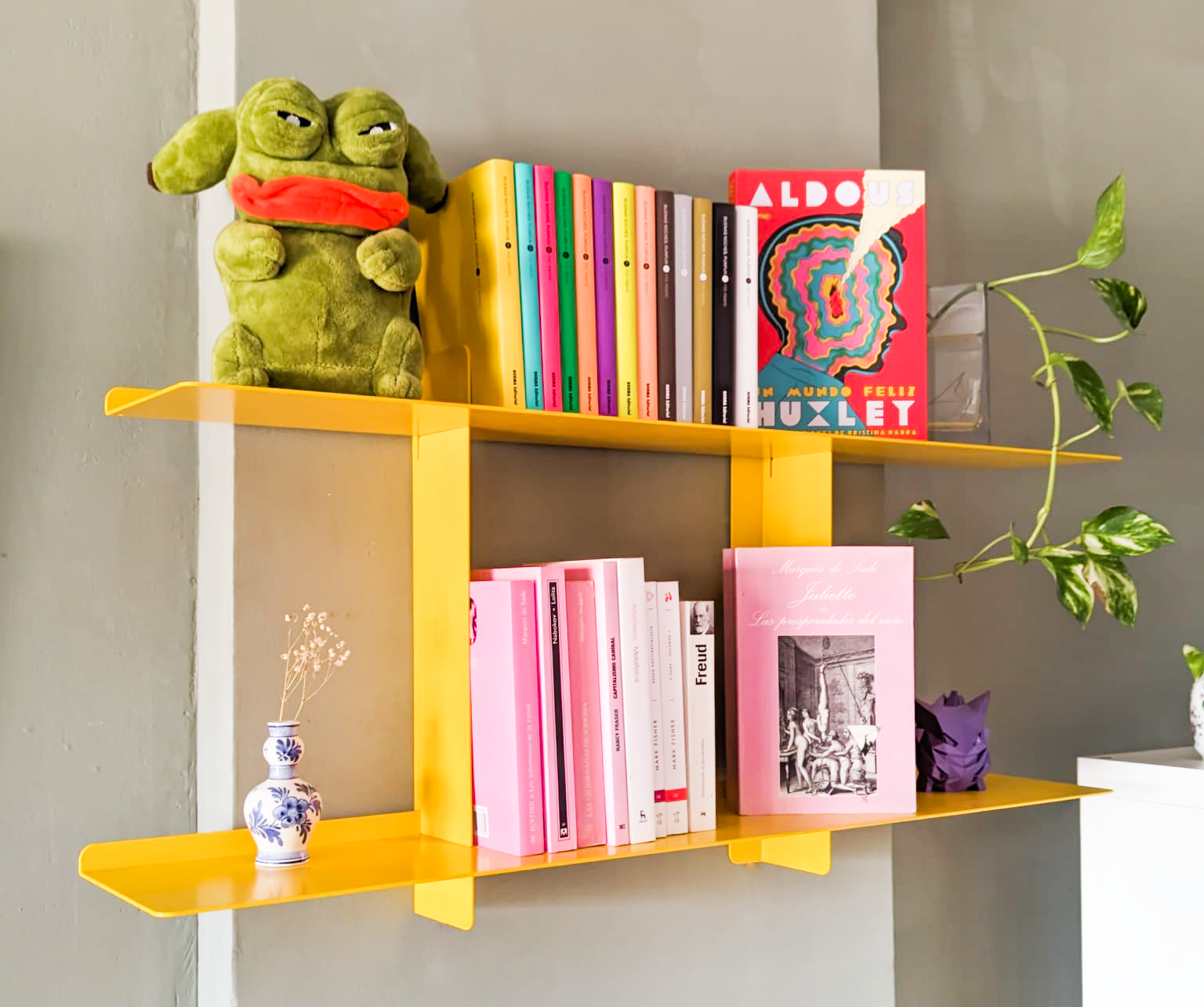 Prestatgeria de paret modular. Disseny flotant i sostenible en acer. Amb tres lleixes horitzontals desplaçables de 75 o 90cm. Dissenyat i fabricat 100% a Barcelona. Combinable amb la Prestatgeria de Paret SAMBA (2 lleixes). Blanc / Negre / Groc Llimona.