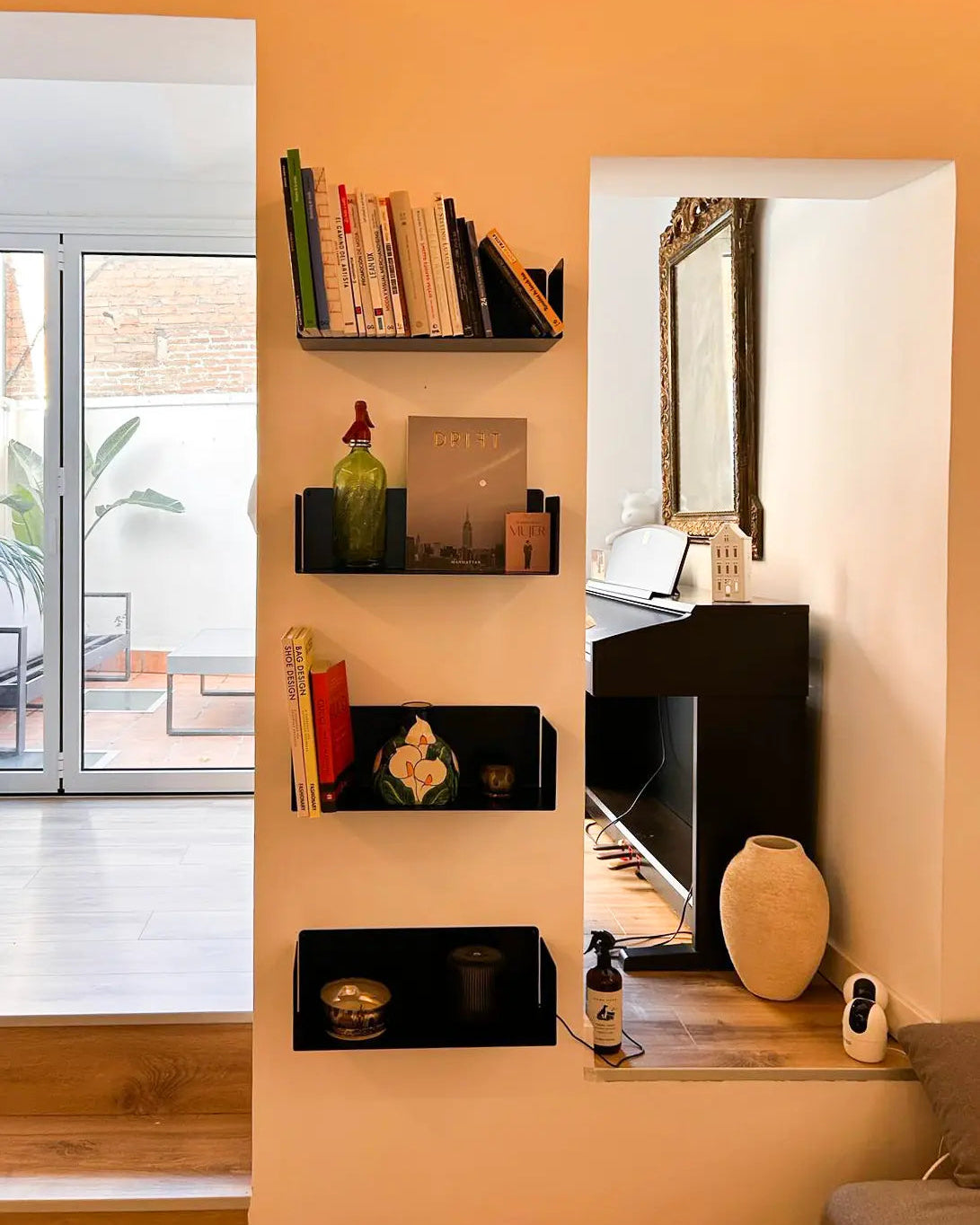 Joc de quatre prestatges flotants de paret. Estructura d´acer de 2 mm tallada a làser i plegada manualment. Organitza i decora les teves parets sense suports visibles. Disseny modern i minimalista.