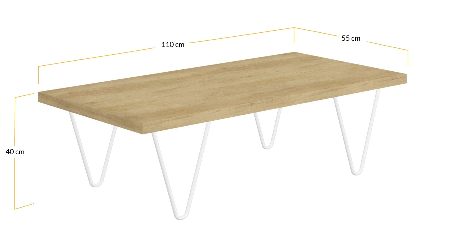 Taula de centre de disseny composta per quatre peus de vareta d'acer corbats en forma de "V" i un tauler melamínic de 40 mm de gruix. Materials dorigen nacional i sostenible. Estil minimalista i industrial.